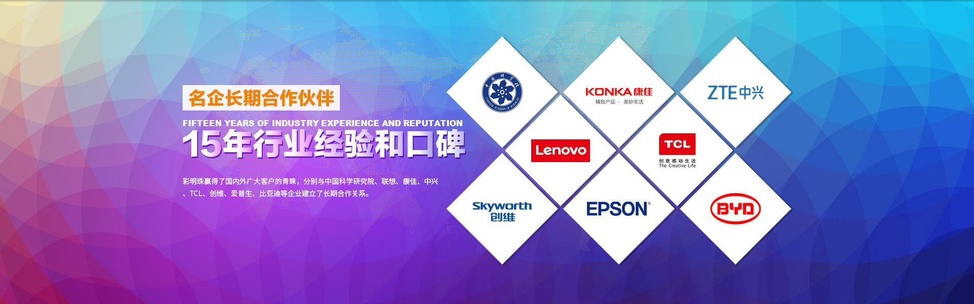 與中國(guó)科學(xué)研究院、聯(lián)想、康佳、中興、TCL、創(chuàng)維、愛(ài)普生、比亞迪等企業(yè)建立長(zhǎng)期合作關(guān)系。