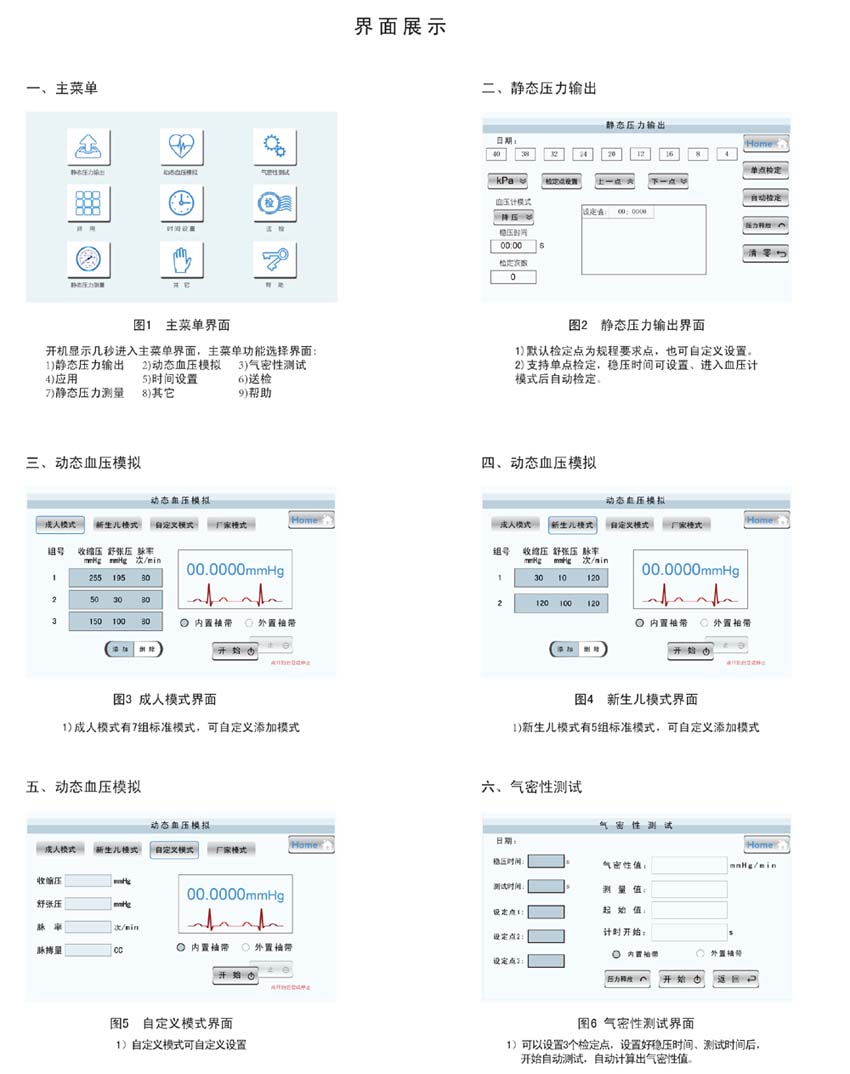 - 具備動(dòng)態(tài)壓力測(cè)量、動(dòng)態(tài)血壓模擬、靜態(tài)壓力測(cè)量、壓力輸出、心率、脈搏測(cè)量、觸屏功能。