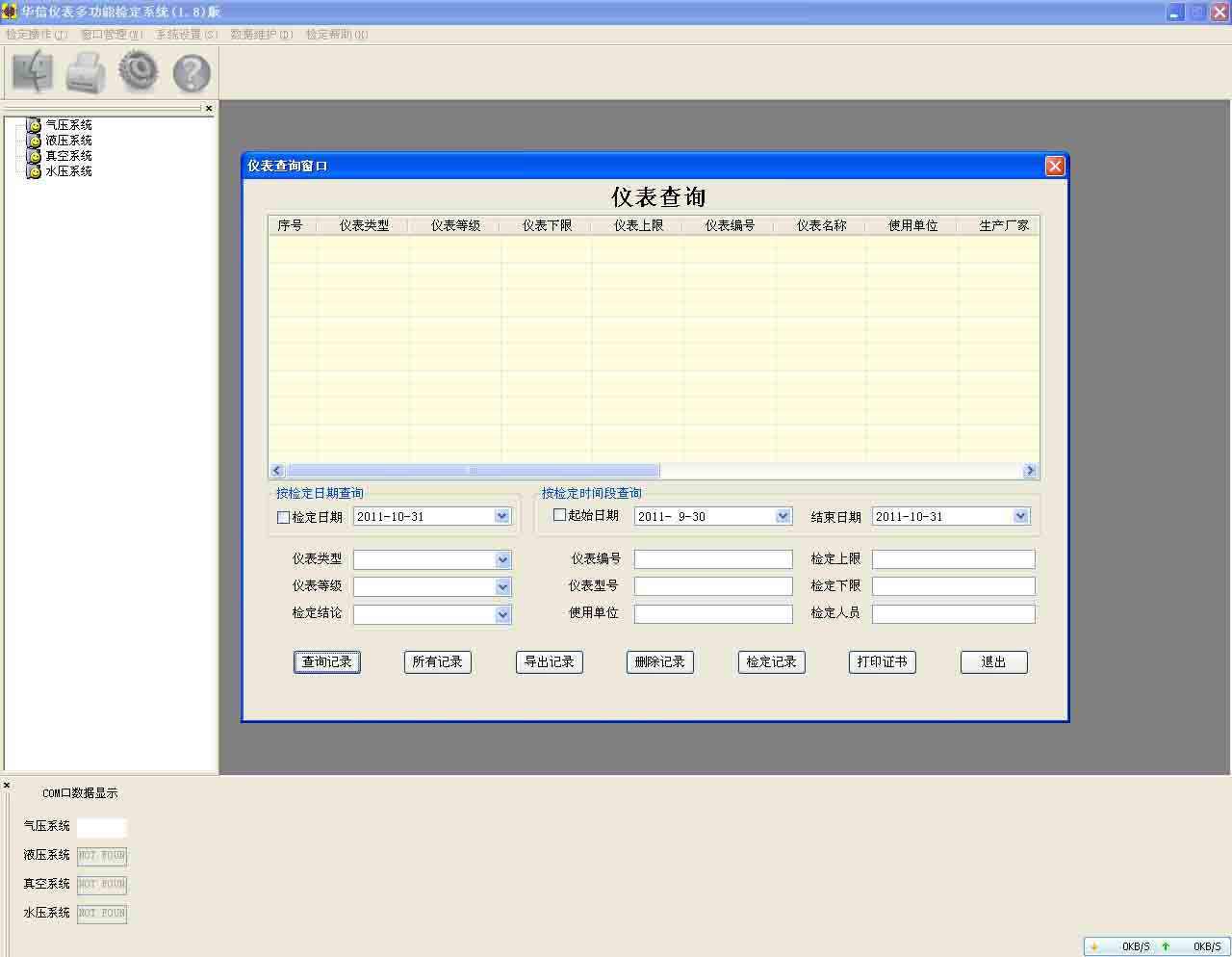 - 可以按照儀表類型、編號、使用單位、時間任意查詢歷史記錄